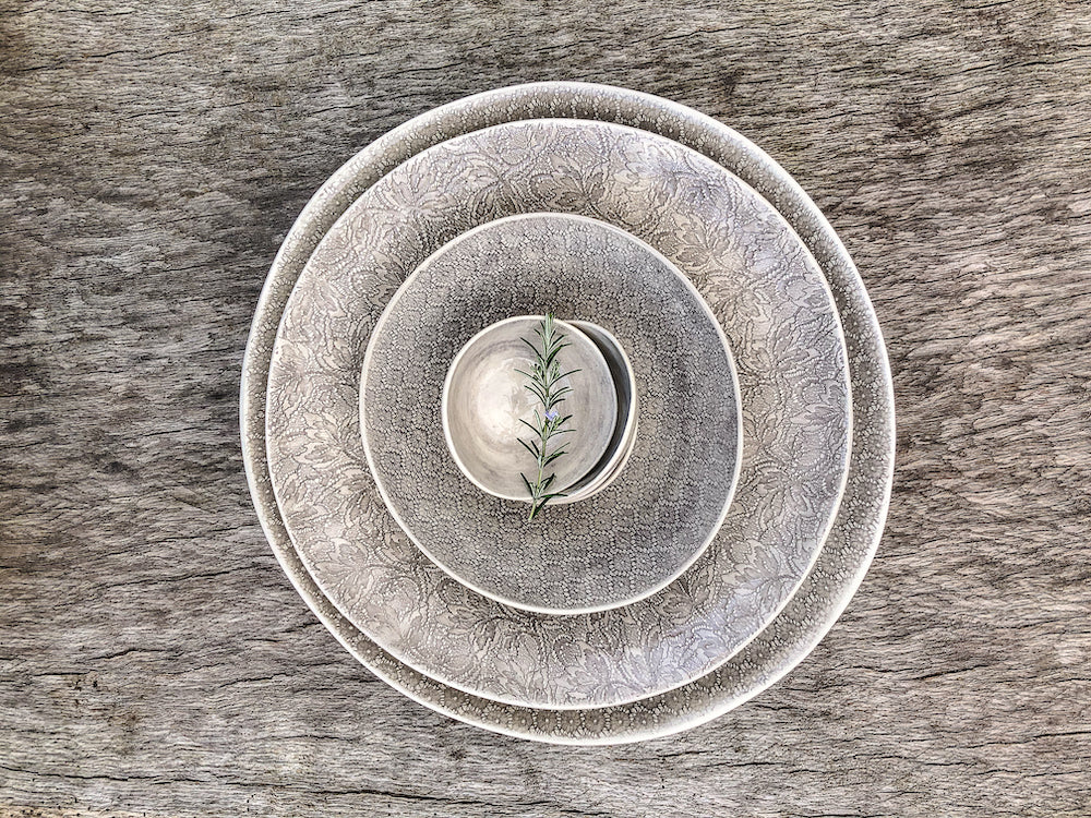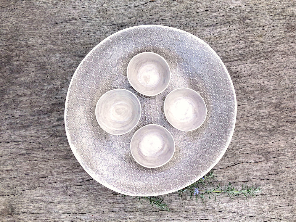The pattern on the serving platter is put into the clay by hand and then painted in the colour of your choice. The ramekins are unpatterned and finished in a plain colour wash.